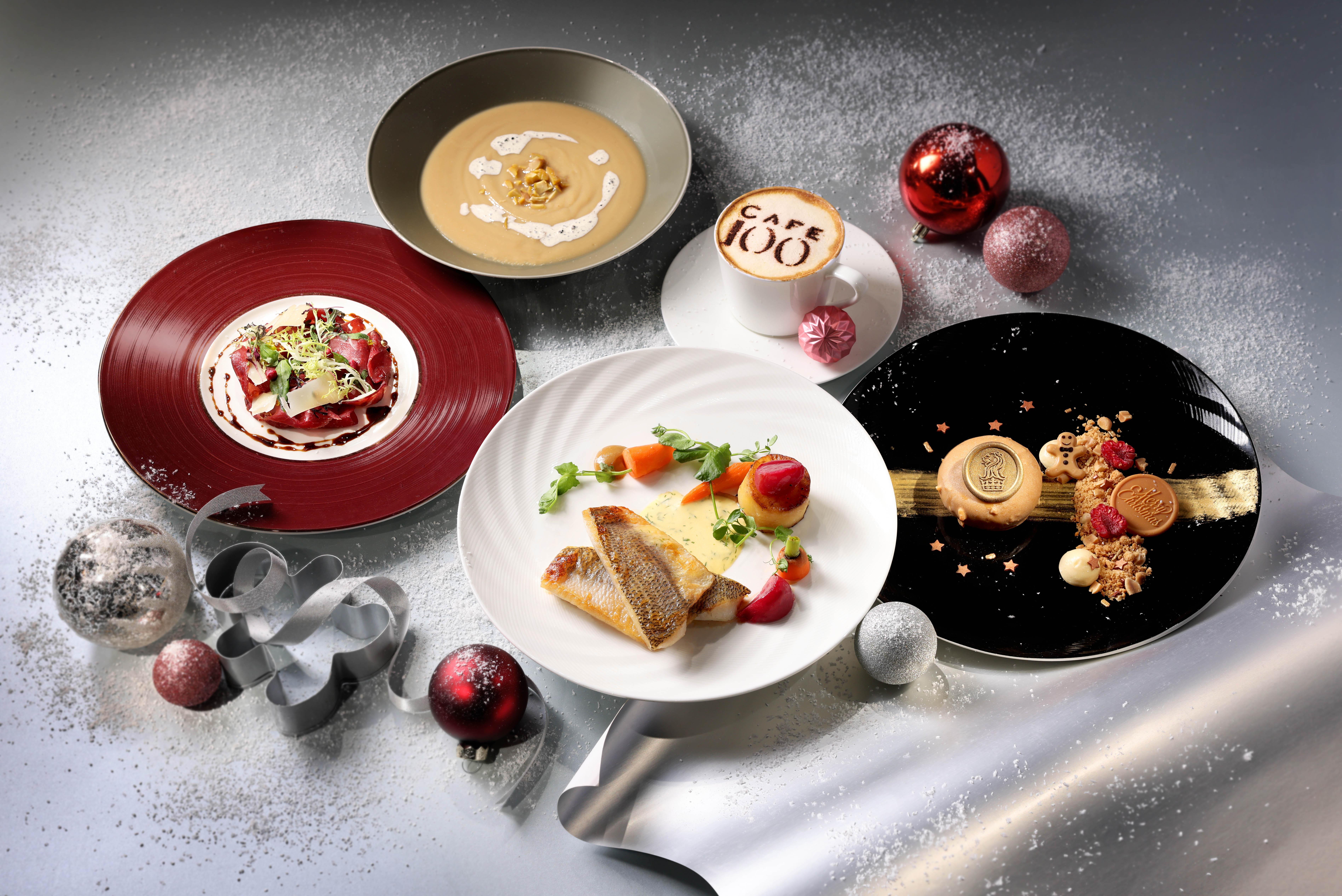 今年 Café 100 將於平安夜及聖誕節當天推出四道菜的限定「聖誕晚餐」,豐盛的美食由開胃前菜開始有自家醃漬香草三文魚沙律及湯品,主菜分別有鮮嫩的烤火雞和時令蔬菜配清新的香草汁及紅莓醬,或香口酥脆的烤味噌比目魚捲配燴白腰豆和蔬菜配柚子忌廉汁;而甜品則有聖誕經典的迷你朱古力榛子樹頭蛋糕,晚餐另設有素食菜單供茹素者享用,美食佳餚配上海港景緻,是您與愛侶來慶祝聖誕節的最佳五星級餐飲盛宴,共同締造甜蜜回憶!