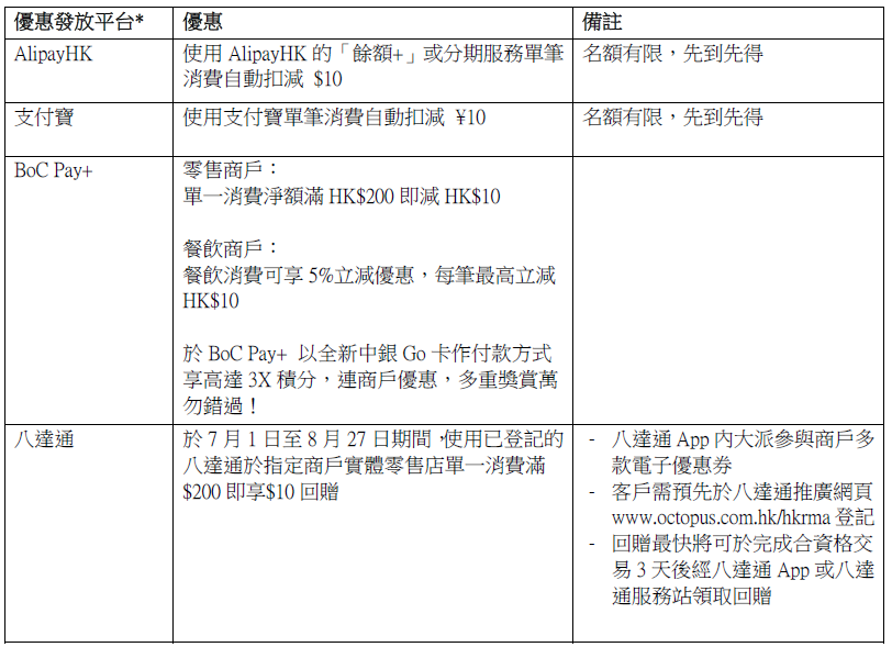發券平台包括AlipayHK、支付寶、多個Alipay+合作錢包、AR LENS、八達通、Tap & Go「拍住賞」、BoC Pay+、香港01、HOY電視、PayMe、WeChat Pay HK、微信支付、環島中港通WeChat小程序。市民可以於應用程式內搶券,即有機會獲得免費禮遇。