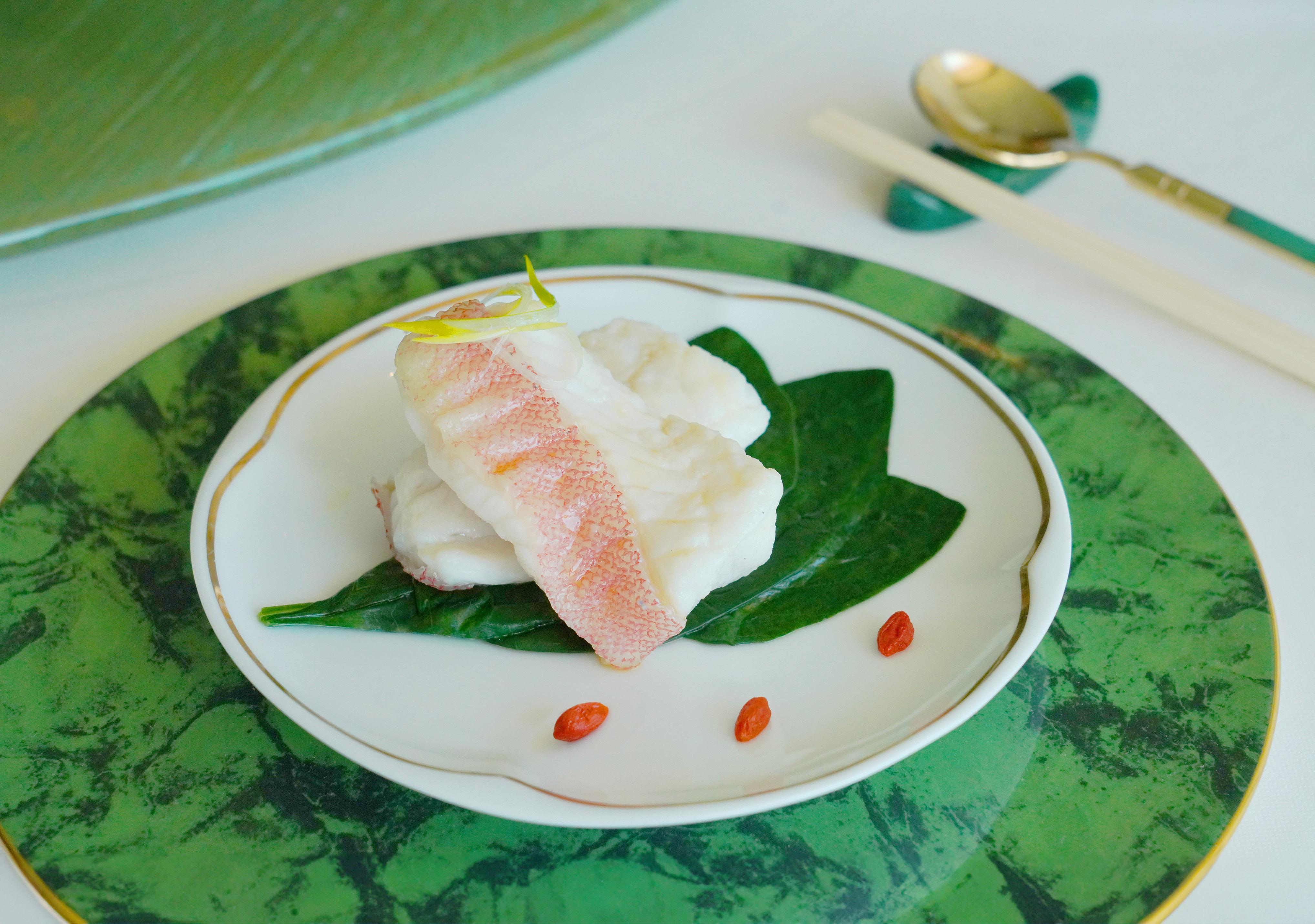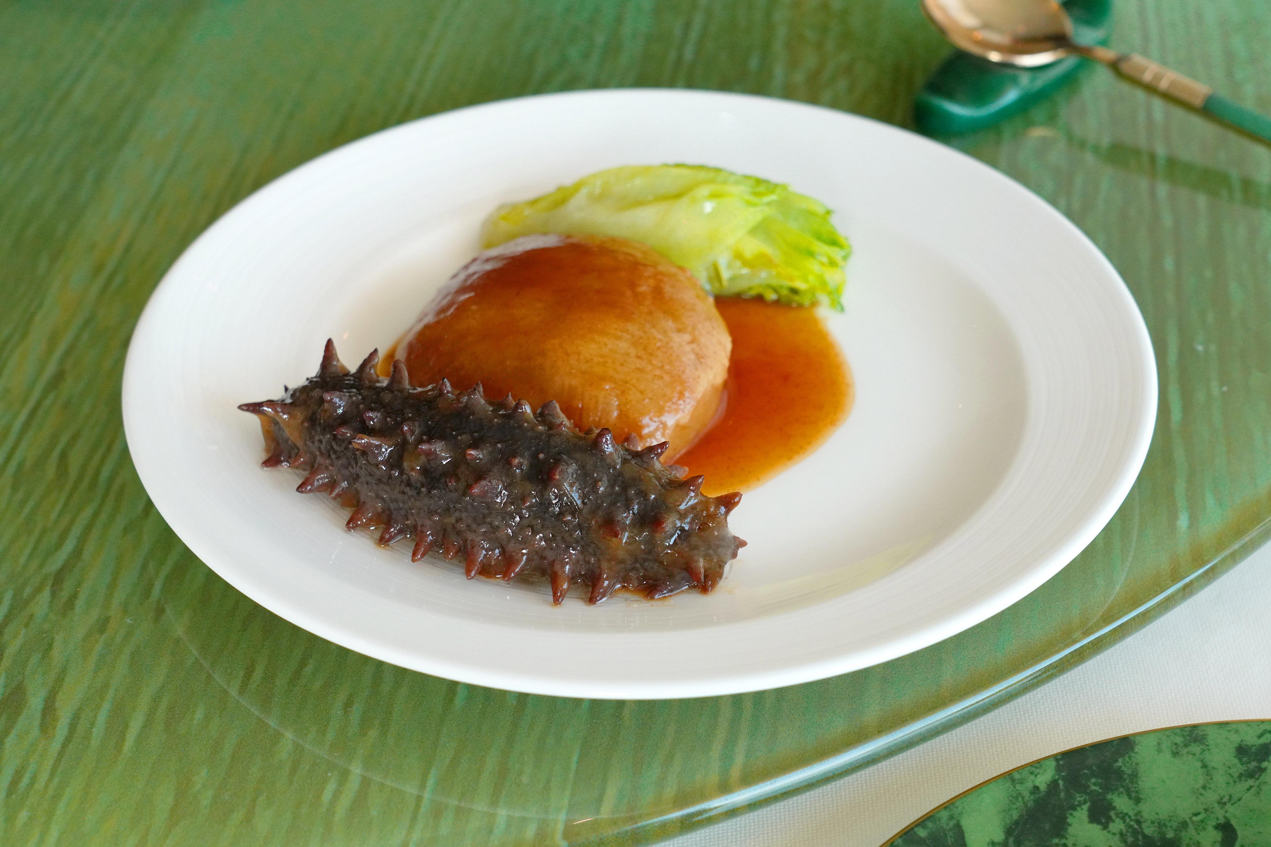 秋日美饌盛宴特意採用鄰近的香港仔漁市場的環保海鮮入饌,充分體現出富麗敦海洋公園酒店的可持續發展理念,分別有龍帶玉梨香伴柚子醋車厘茄、蟹肉冬茸燴燕窩、蝦籽柚皮扣關東遼參、豉油蒸星斑球、濃湯浸絲瓜浸鮮蝦仁、肉骨茶小籠包又及川貝燉原個津梨。心水推介蝦籽柚皮扣關東遼參,不僅將海陸時令食材和諧結合,更彰顯粵菜精髓。菜式工序費時,海參以蠔油蝦籽醬汁中細火慢燉,口感爽滑軟糯,而柚皮需要至少提前兩天準備,經過泡水、用豬油炸至鬆化、以濃湯燜煮等多重工序,雪白的柚皮逐漸變成鬆軟的海綿狀,完全吸收蠔油中的鮮味。另外肉骨茶小籠包更是賴師傅的得意之作,源自新加坡「玉」的招牌菜,餡料內加入充滿胡椒和藥材風味的東南亞肉骨茶,並釀於透薄的小籠包皮之中,美味令人難以忘懷。