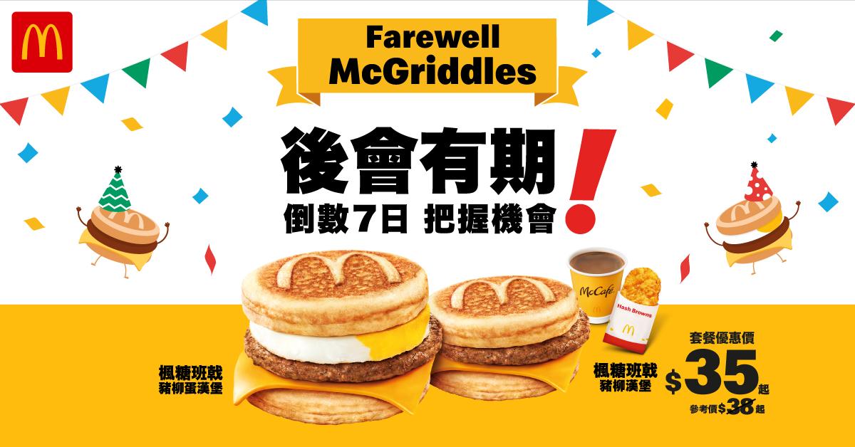 麥當勞宣布McGriddles將於4月9日起暫別香港!來自日本麥當勞的人氣楓糖班戟漢堡系列McGriddles,自去年底載譽回歸後,人氣一直有增無減,獨特的鹹甜風味令人回味無窮。如果大家想重溫這份經典美味,一定要把握最後機會了!