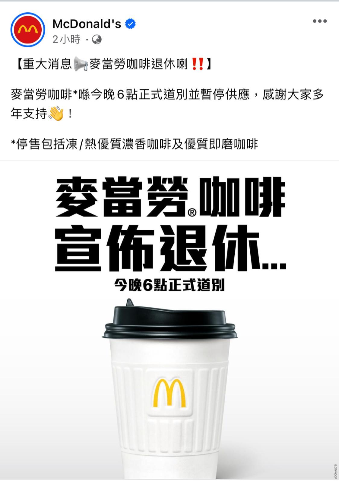 突發!麥當勞咖啡今晚6點暫停供應!(圖片來源:Facebook@McDonald's)