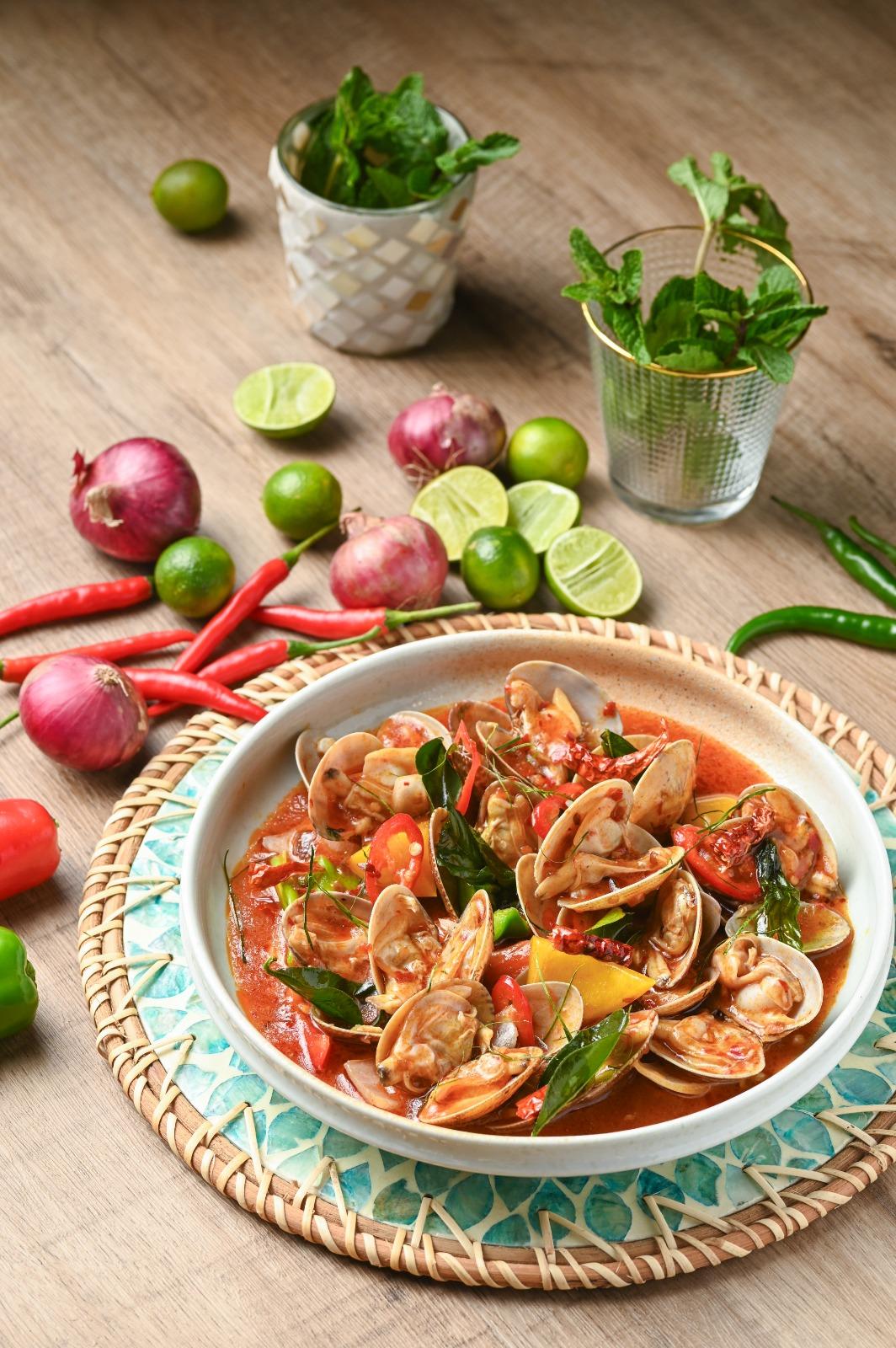 星期二的惹味焦點是以泰國肉蟹炮製的「泰式珍寶蟹肉奄列」($198),精選連接蟹腿間的肌肉部位打造厚實飽滿的珍寶蟹肉,並以嫩滑且帶有焦香的蛋卷包裹;蘸上經典是拉差辣椒醬享用,蟹迷必定不容錯過。於星期三呈獻的「泰式辣椒膏炒蜆」($168)則帶有絲絲辣勁,新鮮肥美的大蜆以各式配料如指天椒、紅蔥頭、魚露及金不換等炒香,完美演繹泰國夜市風情。
