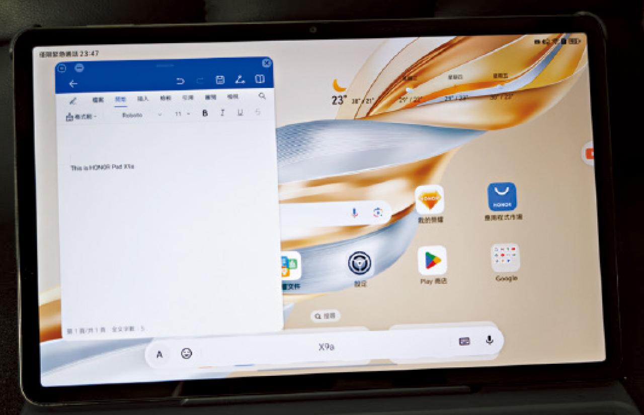 HONOR Pad X9a只有475克重和6.77毫米厚度,拿出街仍然輕便,連智能藍牙鍵盤重量都可接受。淺金色的金屬機身有質感,優雅堅固,後置800萬像素相機及前置500萬像素鏡頭,攝影雖不算頂級,但紀錄、視像通話及會議都足夠應付。亦勝在配備256GB大容量內存,支援35W快充的8300mAh電池,待機時間多達70天,足夠日常使用。