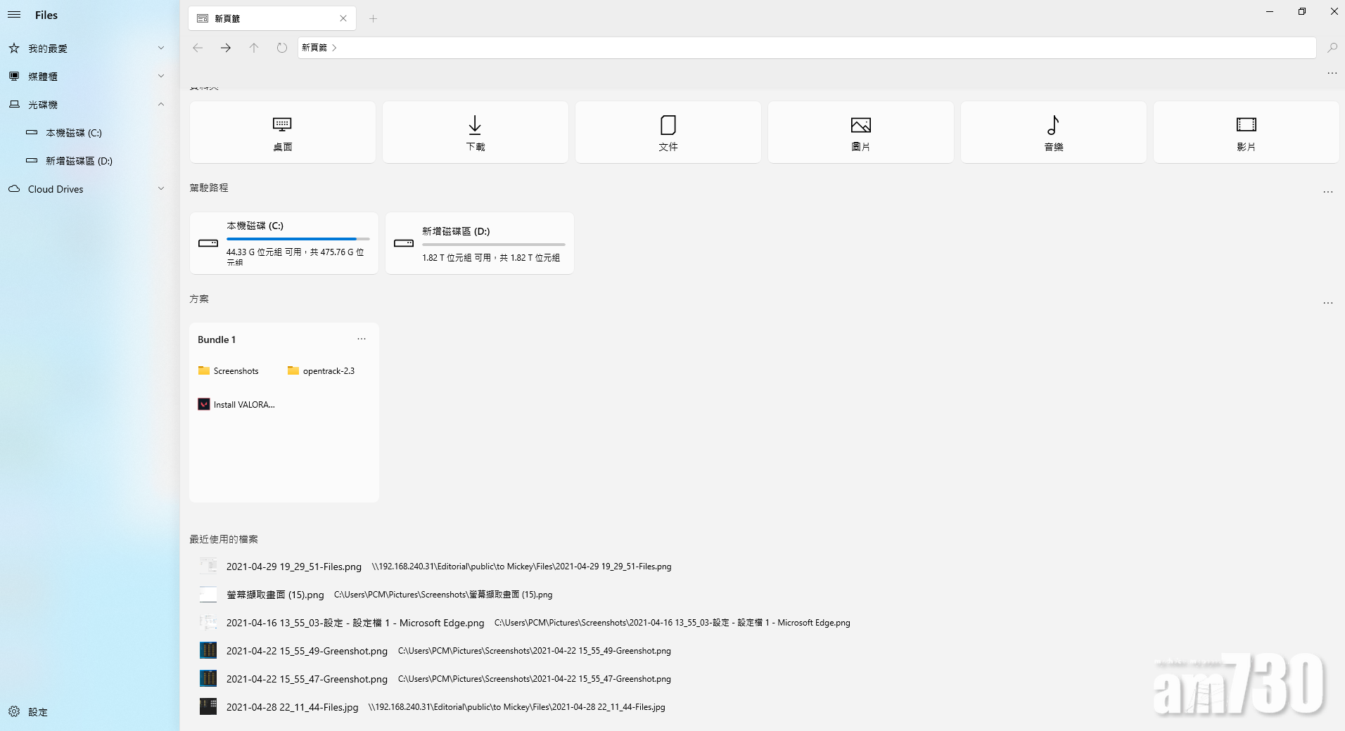 大家只要到Microsoft Store搜尋「Files」就能找到這款免費程式。正如上文所說,它是一個有分頁功能的檔案總管,一打開它就會見到Home畫面和大家熟悉的側邊欄。Home畫面上列出已經掛載的磁碟機和常用的文件夾如「文件」、「圖片」、「下載」等。另外還有可以將常用資料夾的連結集合在一起的「方案」功能,和顯示最近開始檔案,可說是檔案總管的補完版。