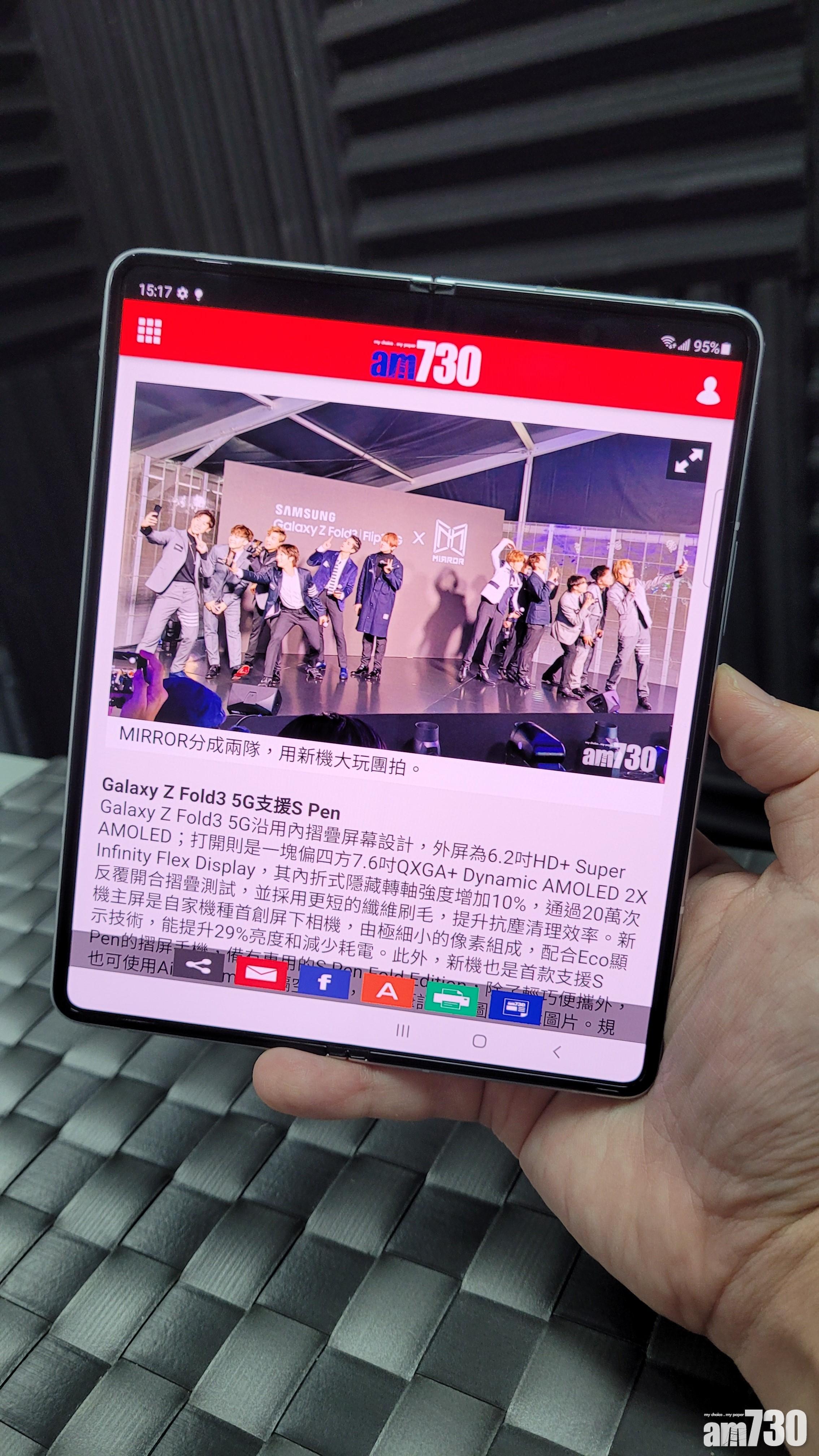 瀏覽《am730》網站,尤其在Fold3時,網頁內容佔盡屏幕空間,相當好睇。(廖俊斌攝)