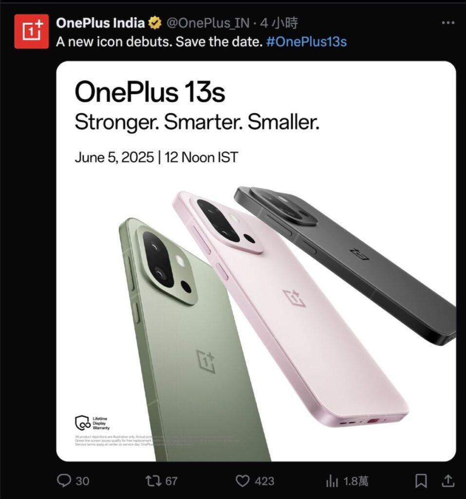 據OnePlus India官方X帳號宣告,其將於香港時間6月5日下午2時半舉行新品發佈會,屆時將推出新作OnePlus 13s手機。