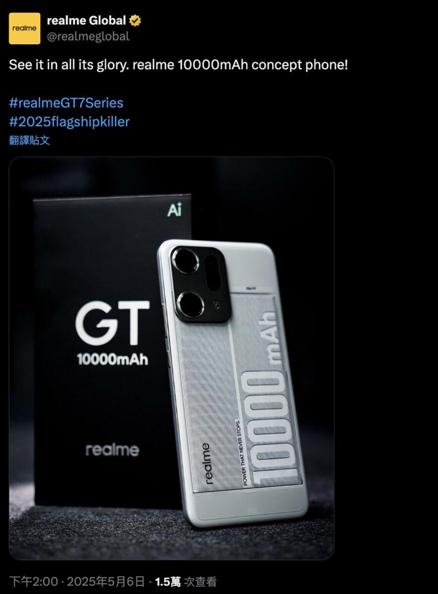 今日手機電池容量可以有幾大?早前realme全球官方X帳號,就展示了配備高達10,000mAh電池的Realme GT7概念手機,其同時對應320W極限閃充,並保持僅8.5mm厚度、跟215g機重正常體積。