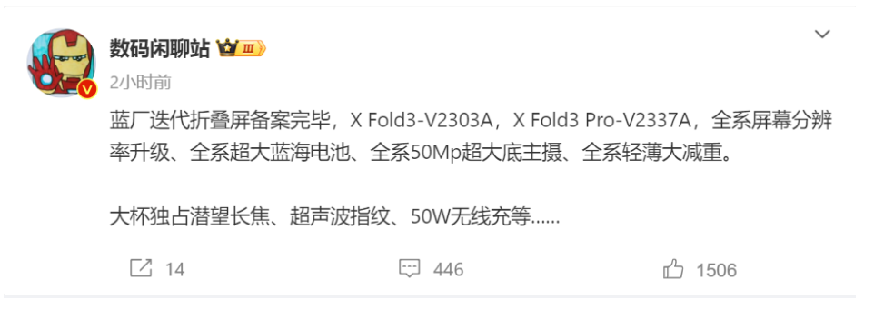 早前兩款型號為V2303A和V2337A的手機已經在中國工信部入網,而@數碼閒聊站也在其帖子中指明,V2303A 是X Fold3;V2337A 則為X Fold3 Pro。
