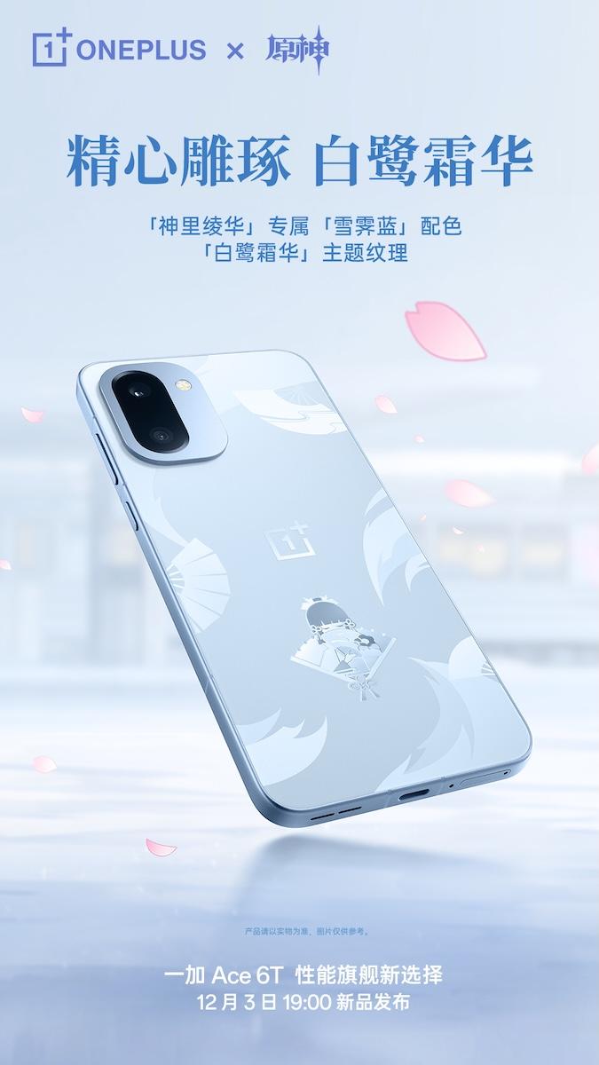 OnePlus Ace 6T 原神訂製版手機以人氣角色「神里綾華」為主題,採用源於角色設計元素的「雪霽藍」限定配色,並於機背加入「白鷺公主」專屬紋理。