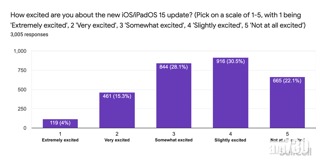 此外,報告又指超過一半Apple用戶(52.6%)對於剛推出開發者測試版的iOS/iPadOS 15,只感到「輕微(slightly)」興奮甚至「完全不(not at all)」興奮。28.1%用家則只表示對新OS感到「一點(somewhat)」興奮。