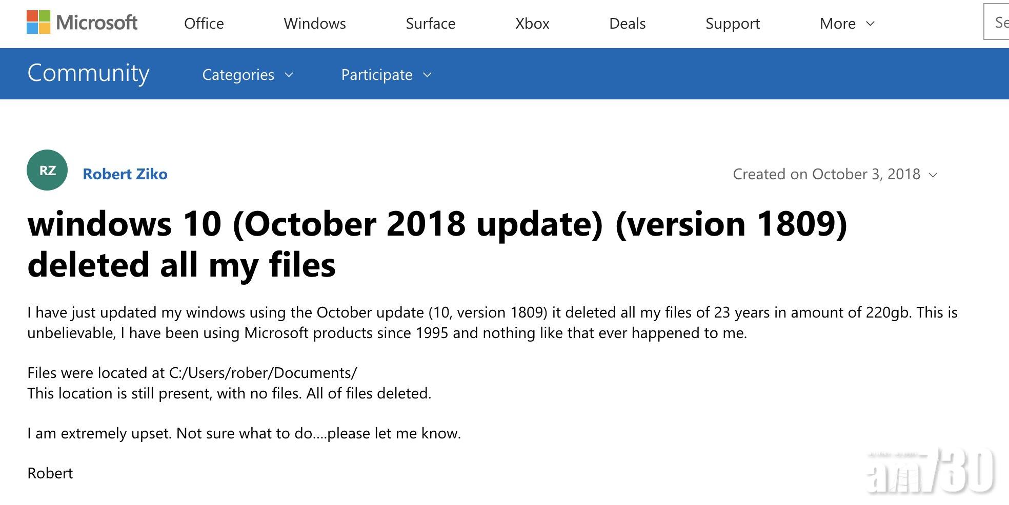 有使用Windows作業系統23年的忠實用戶在微軟論壇上貼文指,升級後遺失了220GB檔案。