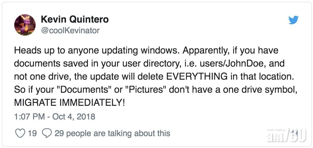 有人認為問題出自微軟的雲端服務OneDrive,更在Twitter發表貼文呼籲想升級的用戶應在升級前,將文件和圖片整合至OneDrive,當然這說法亦值得商榷。