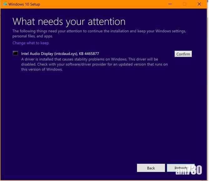 微軟在支援網站上張貼告示,提醒用戶在升級時遇上圖中警告,不應該繼續升級(圖為英文版Windows 10)。