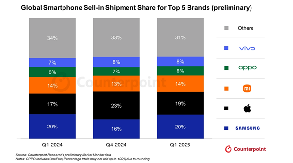 據市場調研機構CounterPoint最新發布的2025年第一季度全球智能手機市場報告顯示,全球智能手機出貨量同比增長3%,主要受益於中國、拉丁美洲及東南亞市場需求強勁回升。在這波市場復甦中,小米與Apple表現尤為亮眼!