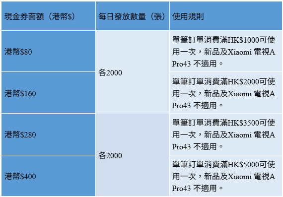 即日起至4月30日於mi.com換領購物現金券,包括$80、$160、$280及$400面額,每個MI ID每天限領1張,領購物現金券可在4月30日晚上11:59前使用。
