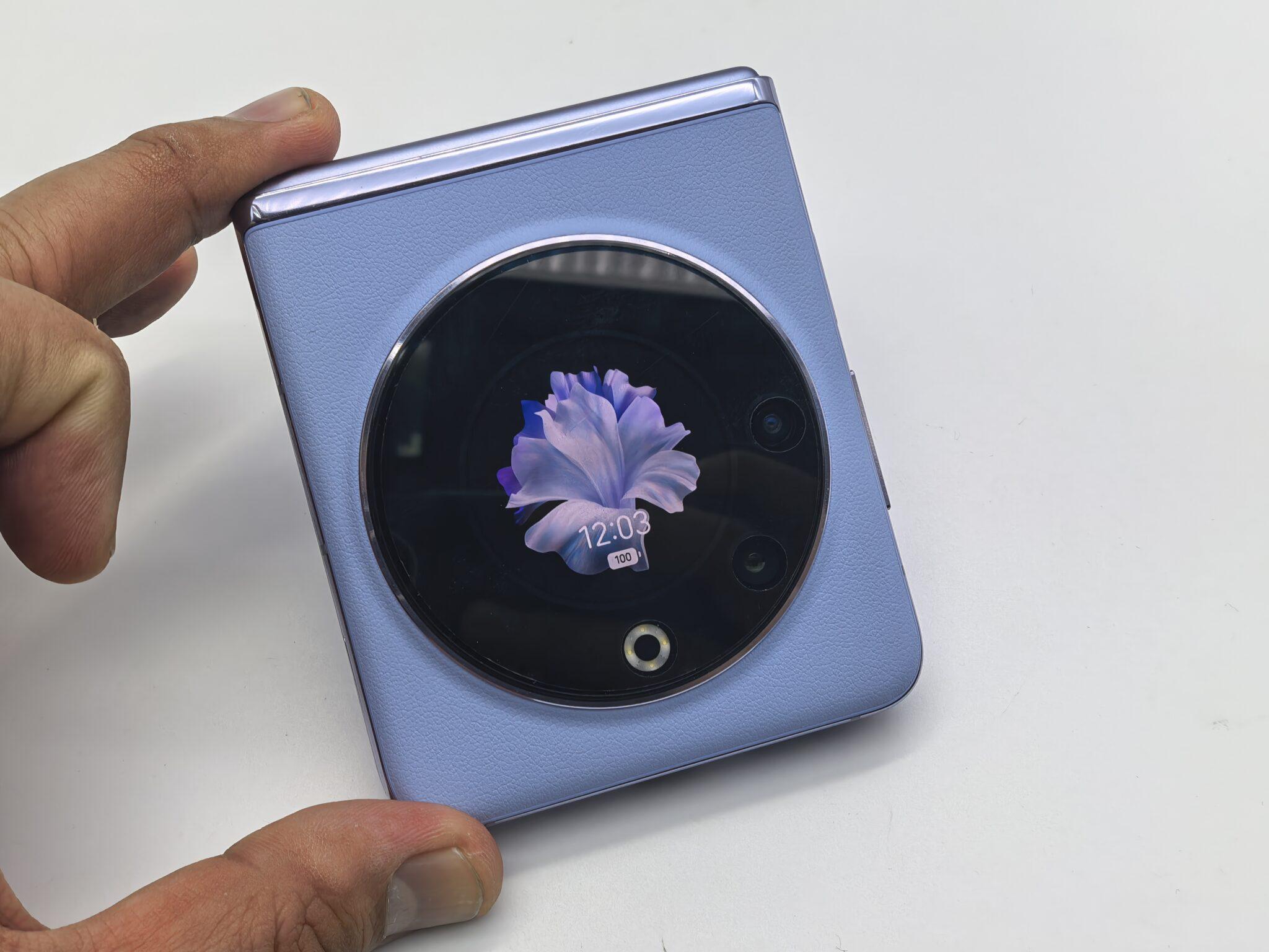Phantom V Flip 5G的最大亮點在於其創新的機身設計。它將一塊1.32吋的圓形外屏置於機身上半部的中心,相機鏡頭與環形閃光燈則巧妙地環繞其周邊,形成一個極具辨識度的視覺布局。這塊圓形外屏的畫素密度為352ppi,能清晰顯示通知、時間、天氣及拍攝預覽,提升了摺疊狀態下的操作效率。