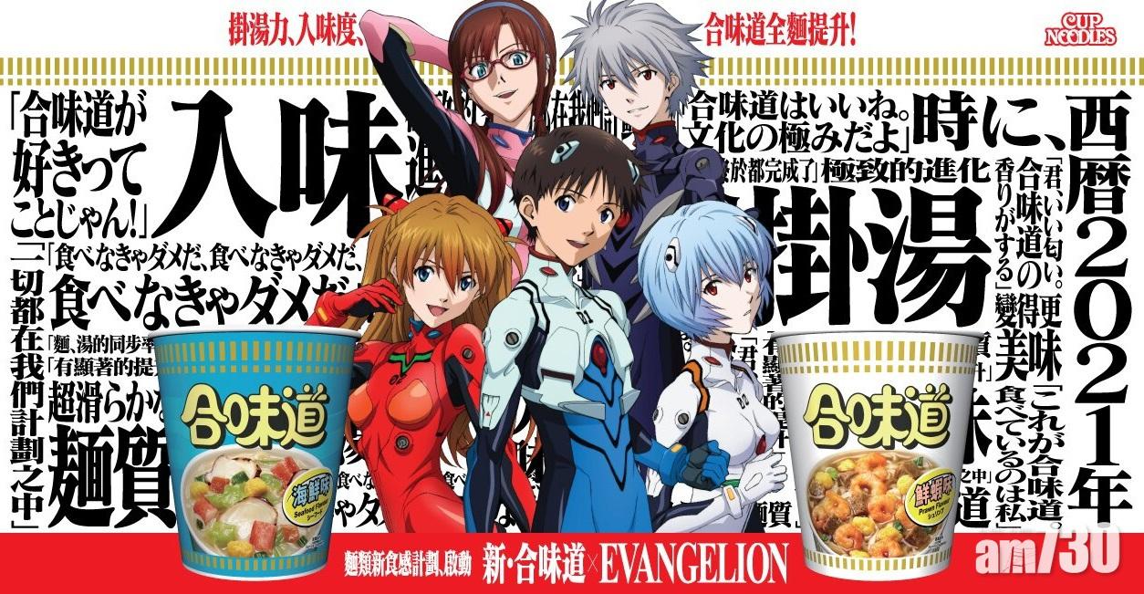 為慶祝日清合味道誕生50周年,官方跨界跟動漫神作《新世紀福音戰士》聯乘,啟動「麵類新食感計劃」!分別於合味道海鮮味、香辣海鮮味及鮮蝦味杯麵包裝,換上碇真嗣、綾波麗及明日香等一眾主角及EVA機體的彩色插圖,9月起陸續上市。同時也推出超限量「日清合味道xEVANGELION限量收藏杯麵禮盒」,全黑包裝內藏6款不同造型杯麵,隨機內藏罕有綾波麗或明日香黑白限定版乙款,本月底至9月初在指定零售商發售,每盒售50港元,粉絲極具收藏價值。