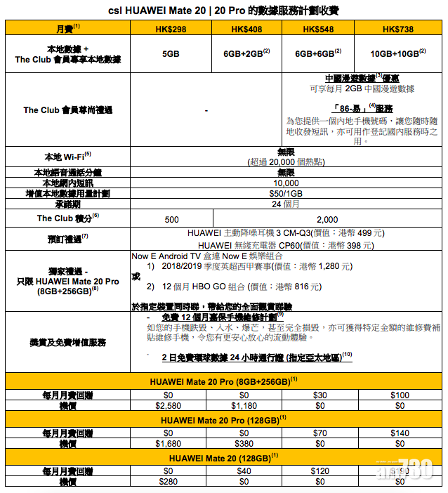 很多朋友留意的極光色版本,則由csl就成為了8GB RAM和256GB ROM極光色版獨家分銷商,由即日起,客戶只需選用指定csl或1O1O的Mate 20及Mate 20 Pro買機上台數據服務計劃,可享零機價優惠,所有月費計劃更可享有Now E Android TV盒子及Now E娛樂組合獨家禮遇,當然不缺免費12個月嘉保手機維修計劃及送2日免費指定亞太地區環球數據24小時通行証。