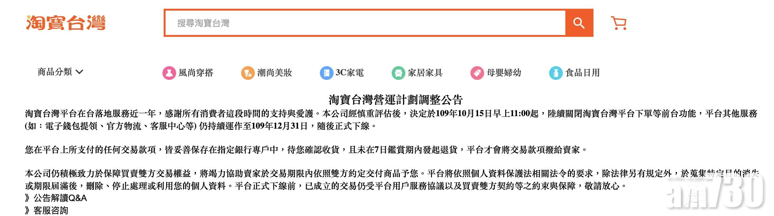淘寶台灣網站首頁現時已經沒有展示任何產品,但點擊進各分類仍然可以看到產品資料。