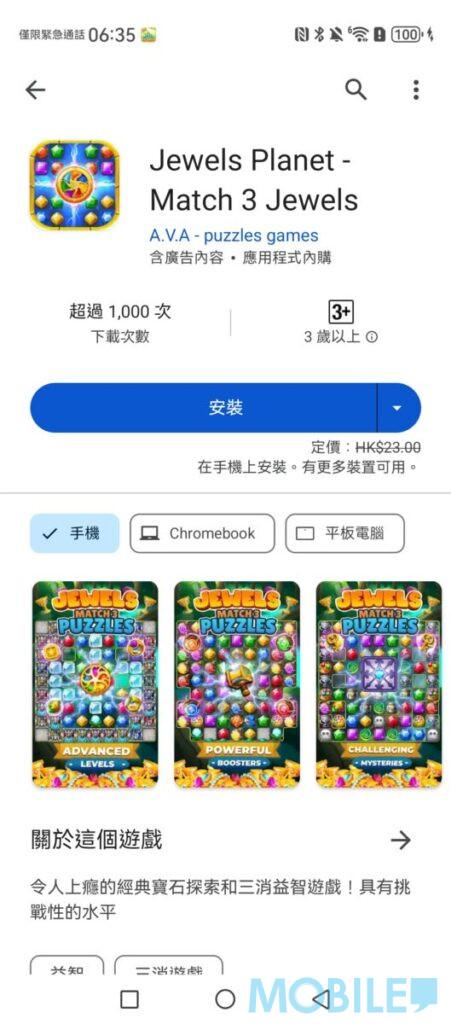 HUAWEI 用家可透過 microG 加入 Google 服務,利用 Gbox 登入 Google Play Store 並搜尋「Jewels Planet – Match 3 Jewels」,經實測可正常下載使用。