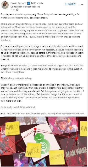 而Sweet Baby的社交媒體帳號亦被網民攻擊,目前X帳號已被封鎖限制。不過該公司的創辦人David Bedard在另一個社交媒體領英(LinkedIn)上喊冤,稱公司及其員工均成為了「極右騷擾運動」的受害者。他表示:「在過去的4個月,我公司成為極右騷擾運動或陰謀論的目標。這對我、共同創辦人Kim Belair、我們整個團隊及同僚的困難時刻。有關的滋擾帶來的挫敗感,讓我們需要採取防範措施,而這種困擾來自整個運動的錯誤信息造成。這些錯誤資訊是瘋狂,它們來自左翼(或右,我估計),甚至令我們不能與它們對抗。」