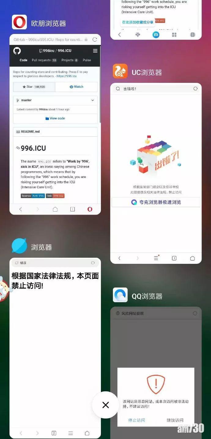 有人指,中國製瀏覽器不是攔截了996.ICU就是禁止關注。
