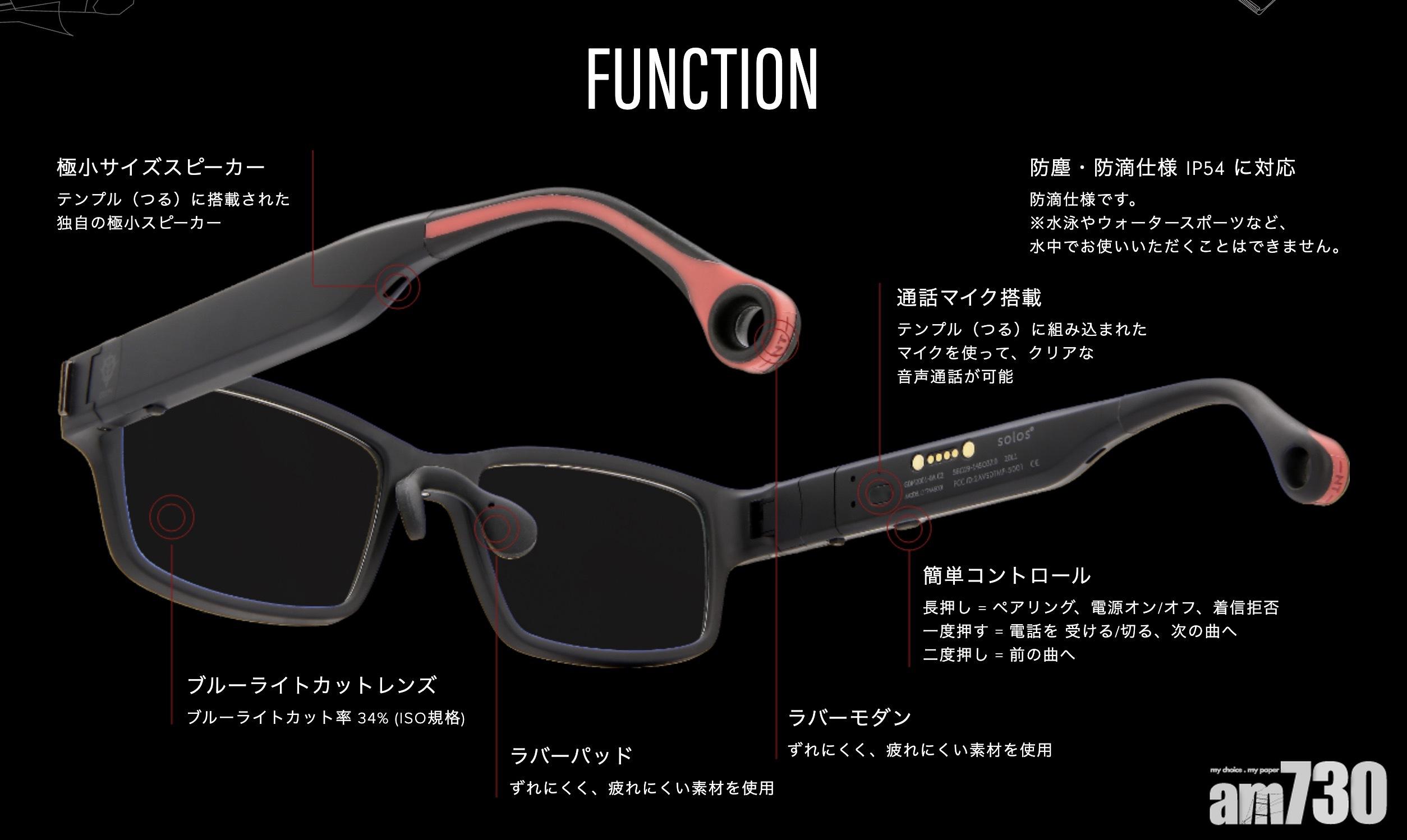 這款音響眼鏡本身也是一個藍牙免提耳機,耳掛兩邊設有半開放式揚聲器和收音咪,不單可以用來聽音樂和通電話,半開放設計也不會阻塞耳朵,用家仍可以聽到周圍環境聲音。眼鏡兩邊臂上各有一個按鈕,不過實際上是觸控眼鏡臂來接聽電話和召喚手機的智能助理,亦可以透過眼鏡臂來觸控調校音量。