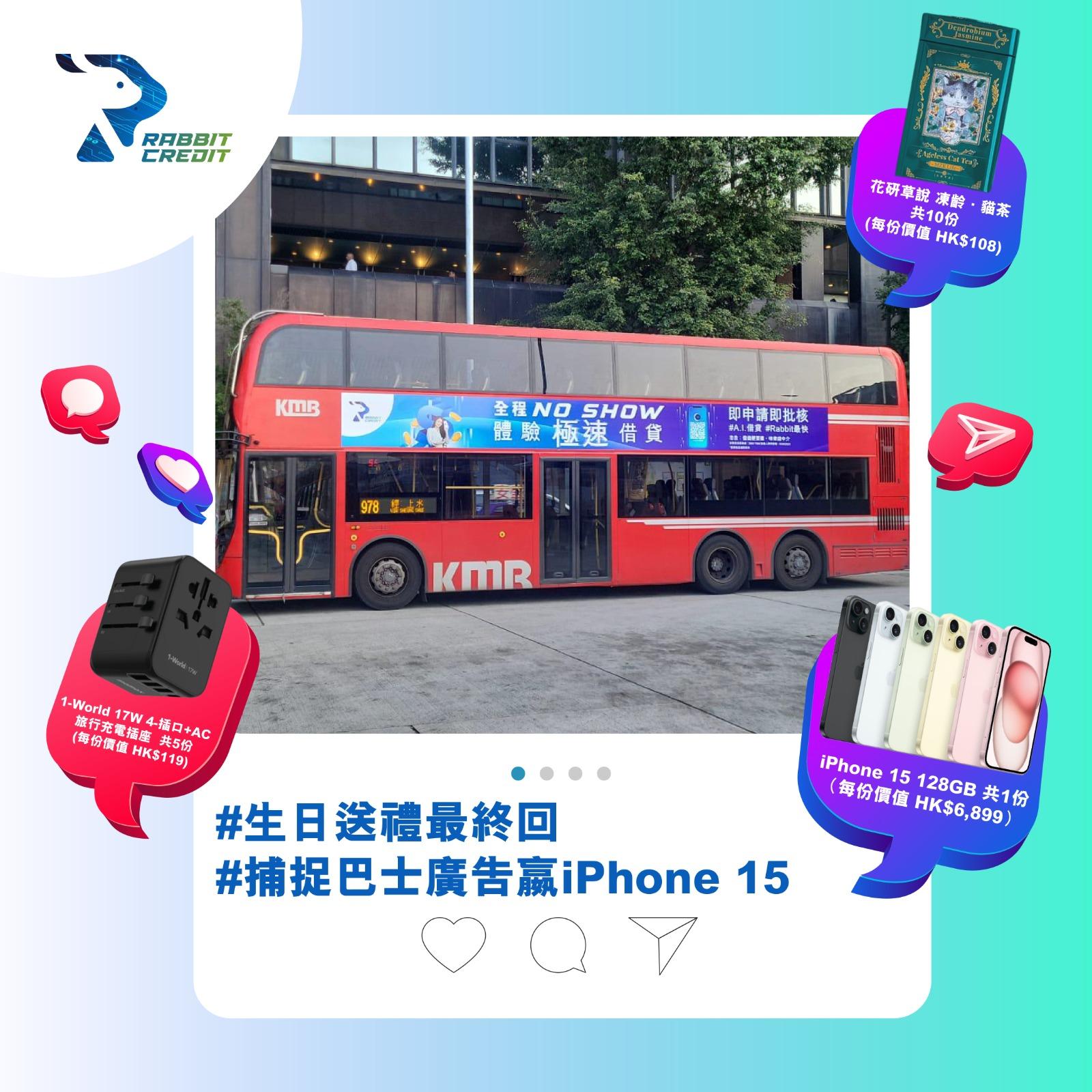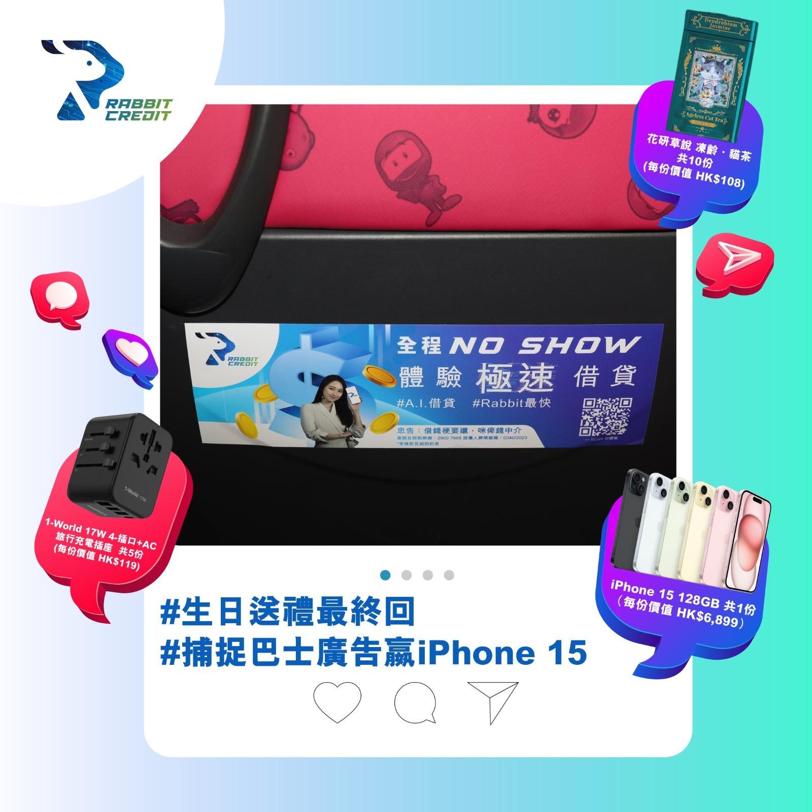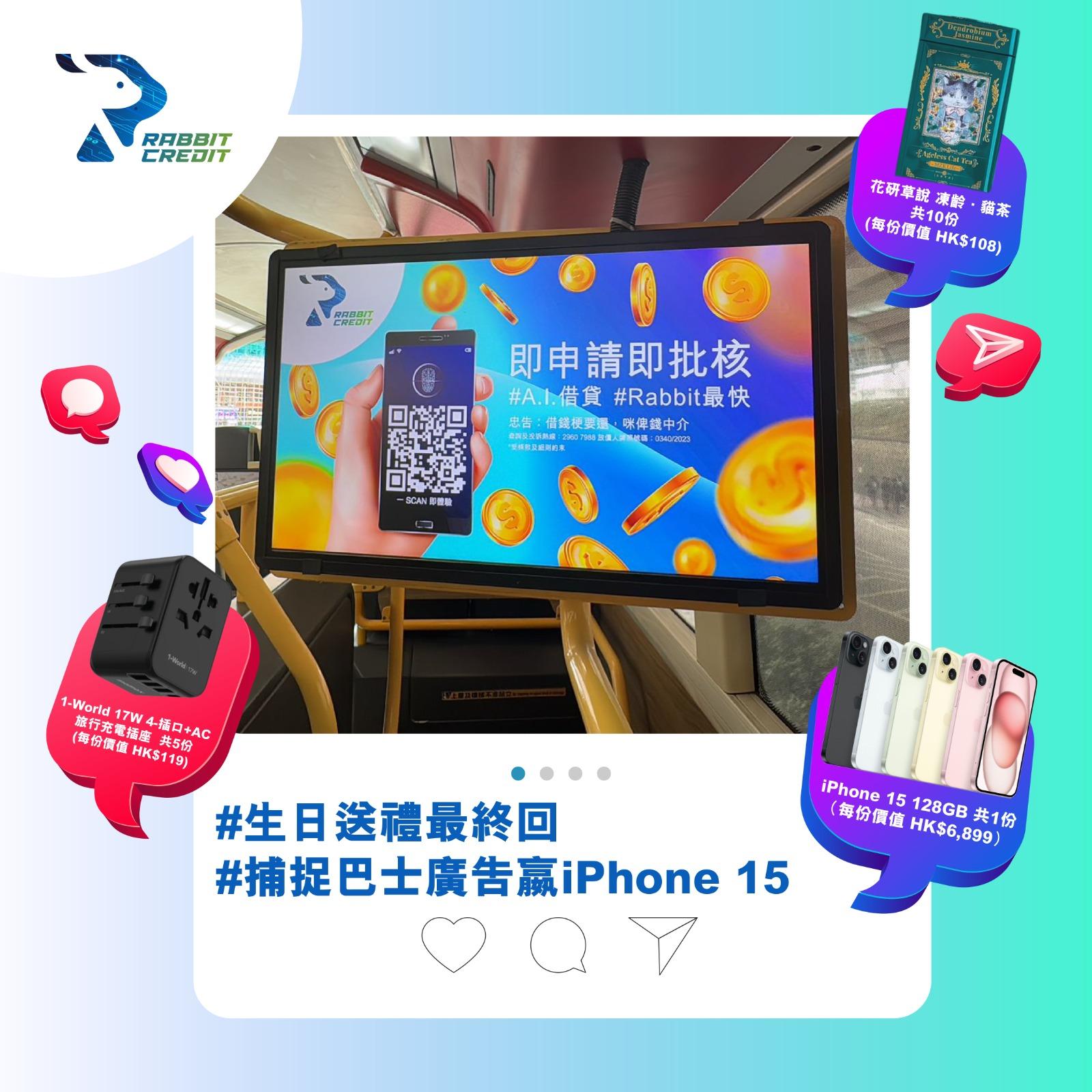 相信最近不少朋友都已經看到印有月兔信貸蹤影的巴士遊走港九新界,記得用手機拍下印有月兔的巴士車身、車廂椅背、車廂電視廣告後,上傳到社交媒體,並在內文加上祝賀月兔信貸生日的說話,便有機會獲得本地品牌「花研草說」的「凍齡.貓茶」養生花茶及旅行充電插座;最能夠氹得月兔「腦細」心花怒放之參加者,更可贏得全新iPhone 15*!