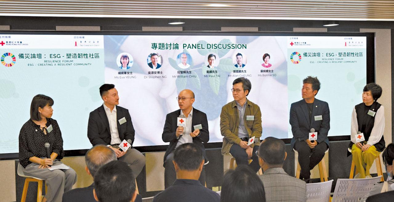 (左起) 香港紅十字會社區備災服務高級經理楊綺華、香港中文大學社會責任及可持續發展處高級經理(科學傳訊)吳頌安、滙豐銀行慈善基金諮詢委員會秘書長招智輝、萬美集團遠東區總裁戴麟、一口設計工作室有限公司聯合創辦人及行政總監張國麟、香港紅十字會行政總裁/秘書長蘇婉嫻就ESG及建設韌性社區手法進行討論。