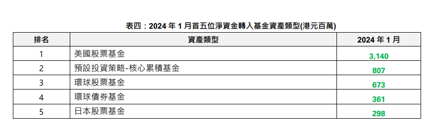 在2024年1月,淨資金轉出最多的為「香港股票基金」、「大中華股票基金」,沬流出12.25億港元;而資金淨流入最多的資產類型為「美國股票基金」,淨流入3.14億元。