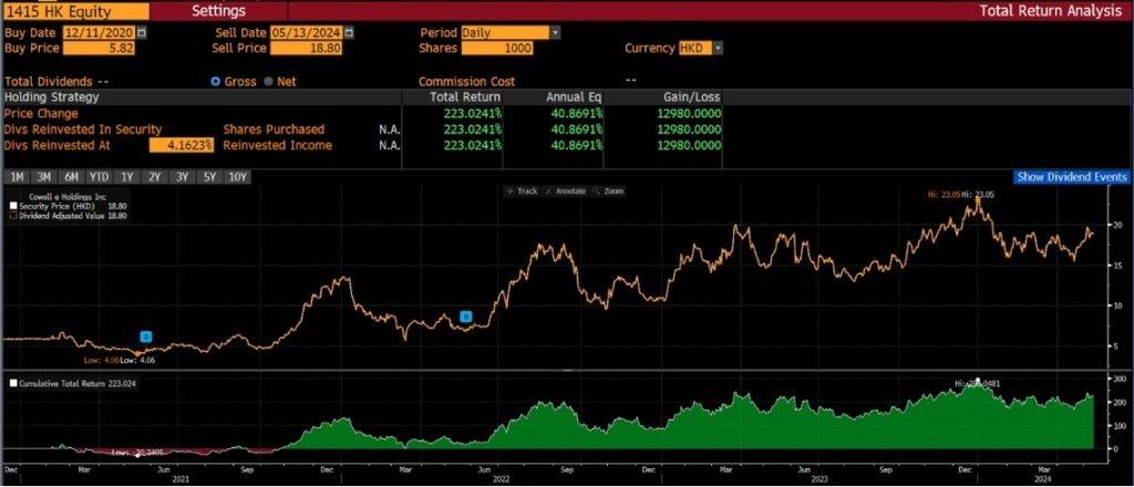 港股內另一個立訊持股的高偉電子 (1415.HK) 亦於2020 年被立訊收購。由收購到現在的股價表現強勁。期內總回報達223%。當時的故事是高偉電子在立訊加持下,從本來只做低端的前置手機鏡頭可以邁向後置鏡頭的高端產品。事實上,高偉於2020年至2022年間收入及純利都有所增長 (2023年宏觀環境變差)。