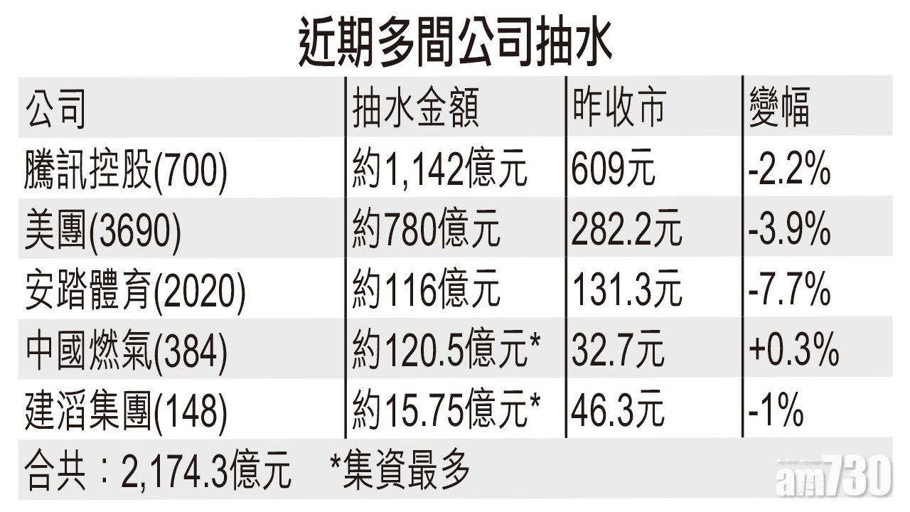 3隻藍籌先後在市場集資後,昨日再有兩間企業於收市後抽水,分別為中國燃氣(384)擬先舊後新方式配股,集資最多120.5億元;建滔集團(148)主要股東Hallgain Management Limited亦擬配售舊股,套現最多15.75億元。連同騰訊控股(700)、美團(3690)及安踏體育(2020)的配股行動,本月至今,5公司合共於市場集資逾2,174億元。