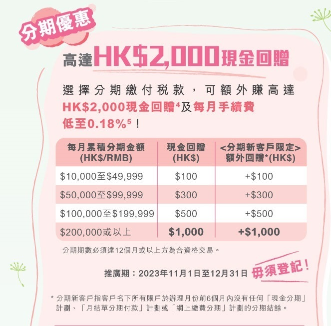 此外,由現時至2023年12月31日,選擇信用卡進行分期付款,將享有額外的現金回贈高達2,000港元(包括基本的1,000港元現金回贈及針對「分期新客戶」的額外1,000港元回贈)。而分期付款每月的手續費率為0.18%。條款受細則約束。瀏覽更多按此(中銀香港官方網站)