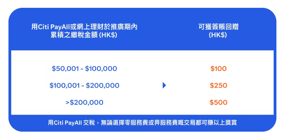 花旗香港(Citi)推出優惠,由現時至2024年2月29日,只要預先登記,並使用Citi信用卡,於網上理財或「Citi PayAll」平台繳交超過50,001港元的薪俸稅,並在活動期間內,累至少3,000港元的合資格零售消費,即可獲得高達500港元的現金回贈,而最高回贈比例為0.25%。信用卡登記網站按此