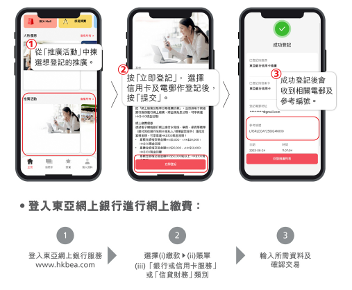 東亞銀行指,自現時起至2024年12月30日,客戶使用BEA Mall App進行登記,並在網上銀行內,使用東亞信用卡支付各種賬單(包括稅款、水電煤、學費、保險等),累計支付金額達到1萬港元,且在優惠期間內完成2,000港元的合資格零售消費,即可獲得最高550港元的現金回贈,相當於最高1%回贈率。條款受細則約束。瀏覽更多按此(東亞銀行官方網站)