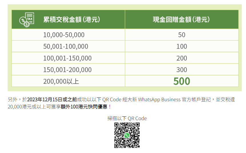 大新銀行公布信用卡交稅優惠,自2023年12月1日起至12月28日,使用大新信用卡支付稅款超過1萬元,即可獲得高達500港元的現金回贈。此外,若在12月15日之前通過WhatsApp登記參加快閃優惠,並支付稅款超過2萬港元,將額外獲得100港元的現金回贈,總回贈率達到0.75%。條款受細則約束。瀏覽更多按此(大新銀行官方網站)