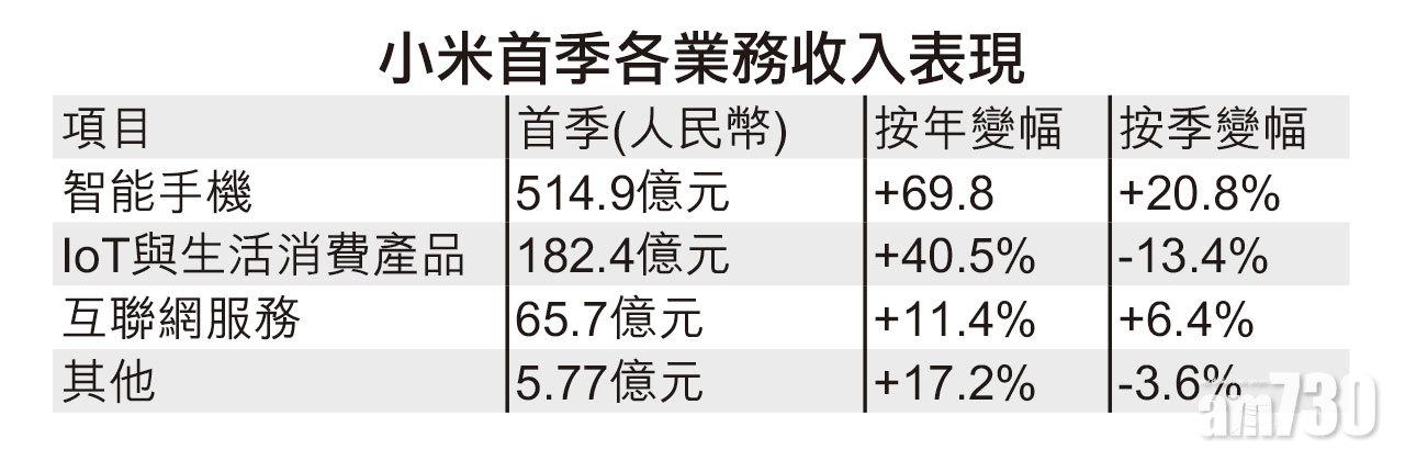 另外,小米集團(1810)昨收市後公布首季業績,期內純利77.9億元(人民幣,下同)(約96億港元),按年增2.6倍,按季減11.4%。非國際財務報告準則經調整淨利潤達60.69億元,升1.6倍,按季漲約89%,勝預期。期內營業額768.8億元,按年增54.7%,總收入和經調整淨利潤均創單季度歷史新高。