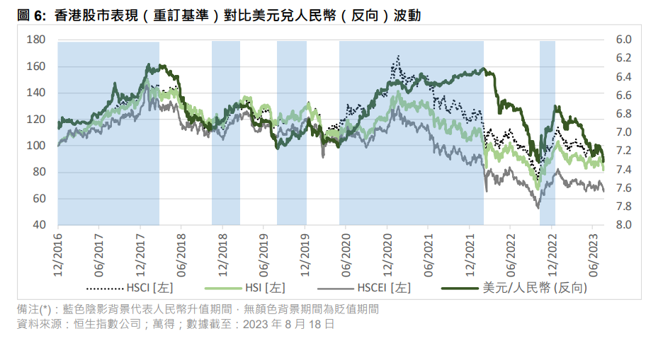 恒指公司認為,人民幣兌美元可能出現反彈之際,基本面而言,匯率上行風險可能對港股估值產生積極影響。因此當某隻股票的報表貨幣為人民幣,而其交易貨幣為港幣時,人民幣升值將推高其等值港幣的公司盈利、自由現金流等,因利率關係及港元與美元掛鈎。