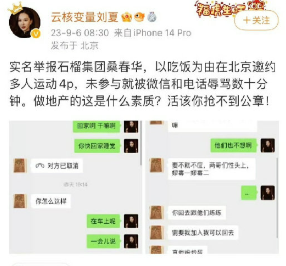 至於石榴集團原副董事長桑春華,亦捲入性醜聞風波。內地雲核變量集團董事長劉夏,日前在網上實名舉報桑春華以「吃飯為由邀約,參與多人運動」,事件曝光後,石榴集團亦決定免去桑春華的職務。