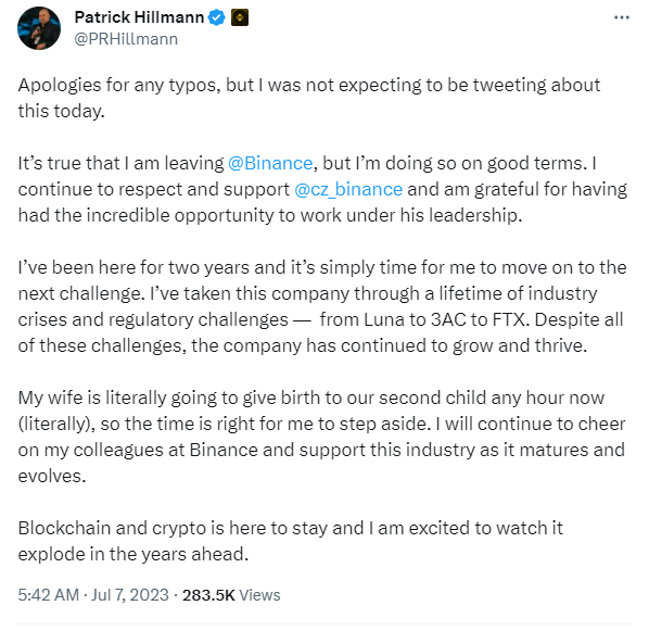 事實上,Patrick Hillmann是因家中其第二位小孩即將出生,故希望將更多時間投入家庭中,而決定辭去於幣安的職位,他在Twitter同時補充,目前與幣安仍維持良好關係。