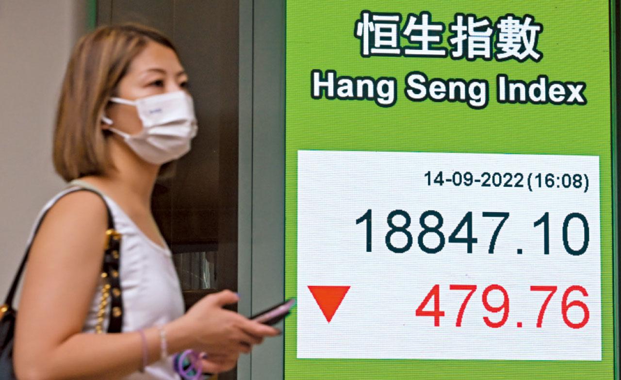 美國上月通脹意外繼續高企在8.3%,拖累美股隔晚大瀉近4%,亞洲股市昨接力走弱,恒生指數最多挫529點,全日在不足200點波動,收市跌479點或2.5%,報18,847點,累計本月已瀉5.6%,再失守萬九關及創近半年低。摩根士丹利發報告指,股市大挫反映市場預測美國下周最少加息0.75厘,並有機會大幅加息1厘,並估計恒指短線逼近該行的最熊預測,即17,000點,潛在跌幅有1,847點或9.8%。