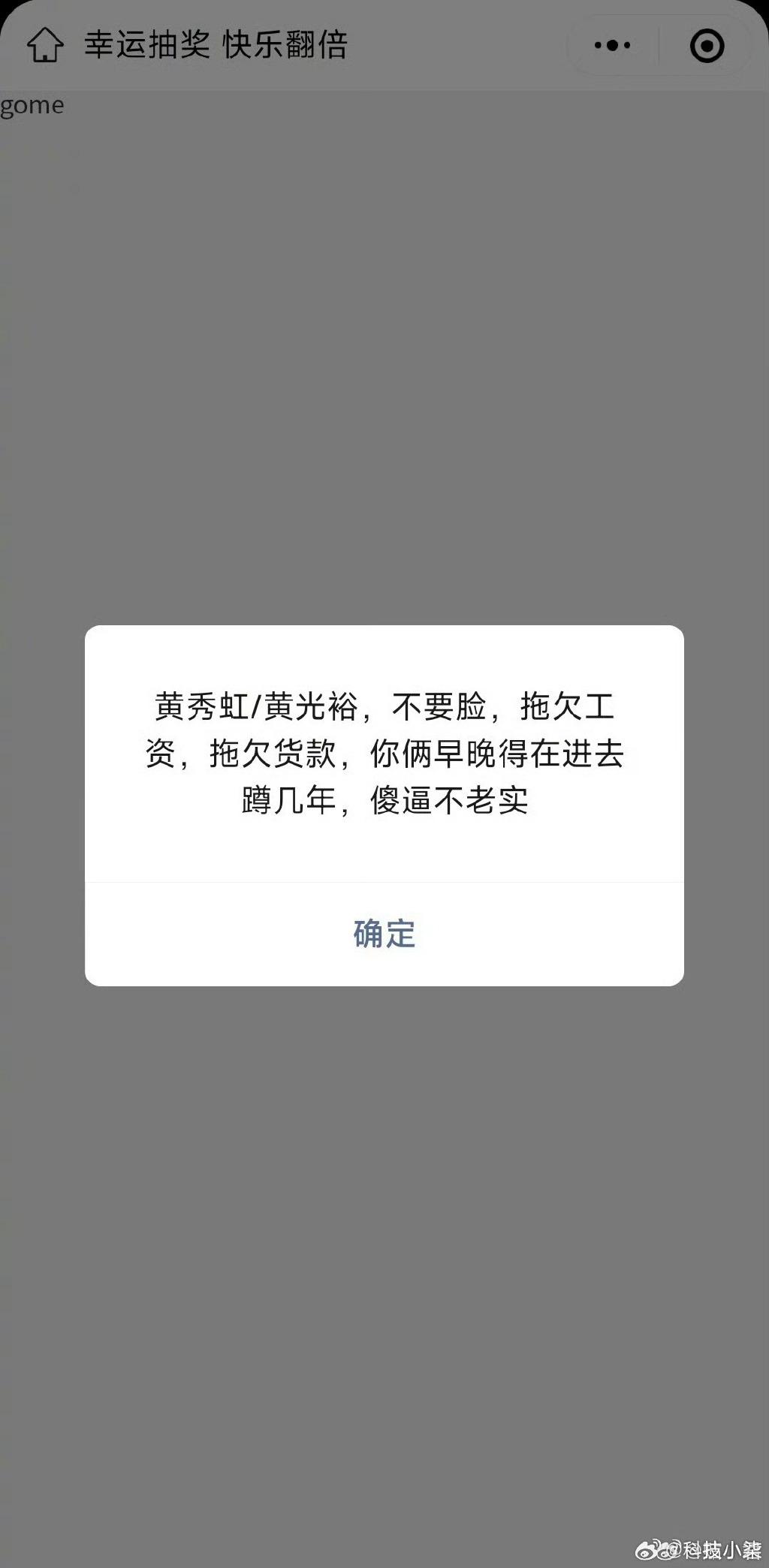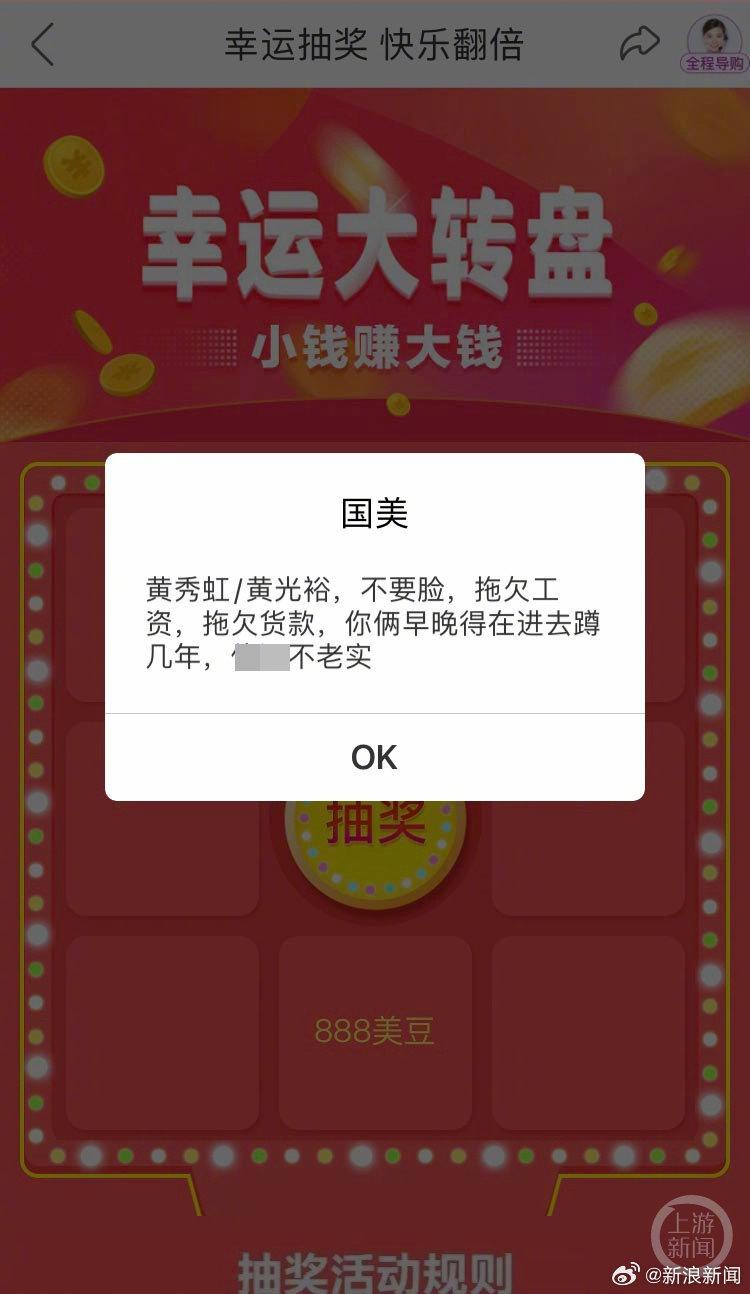 內媒《上游新聞》報道,近日有用戶發現點擊國美App內的「會員俱樂部」頁面的「幸運抽獎」時,會出現彈窗寫上「黃秀虹/黃光裕,不要臉,拖欠工資,拖欠貸款,你倆早晚得在進去蹲幾年,XX不老實」。