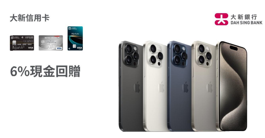 即日起至2月29日,憑大新Visa信用卡成功登記,並於Apple Store零售店及網上商店累積簽賬滿 5,000港元,可享6%現金回贈,賺取高達400港元現金回贈;另以任何大新信用卡累積合資格簽賬每滿1,000港元,即可自動享100%簽賬回贈抽獎機會乙次,贏取高達1萬港元簽賬回贈,更可享6個月0手續費消費分期。