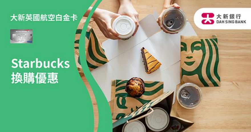 另外,由即日起至2月9日,憑大新信用卡於黃金海岸酒店門市及網上訂購新春賀年糕點可享75折;即日起至4月30日,憑大新英國航空白金卡於香港機場內任何一間Starbucks分店,可以1港元換購Starbucks套餐,套餐包括一杯指定大杯裝手調飲品及一件指定食品。名額有限,額滿即止。上述推廣及優惠須受有關條款及細則約束。
