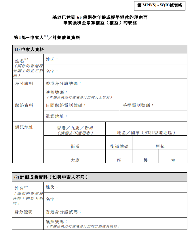 - 積金局《基於已達到65歲退休年齡或提早退休的理由而申索強積金累算權益的表格》(MPF(S)-W(R))
