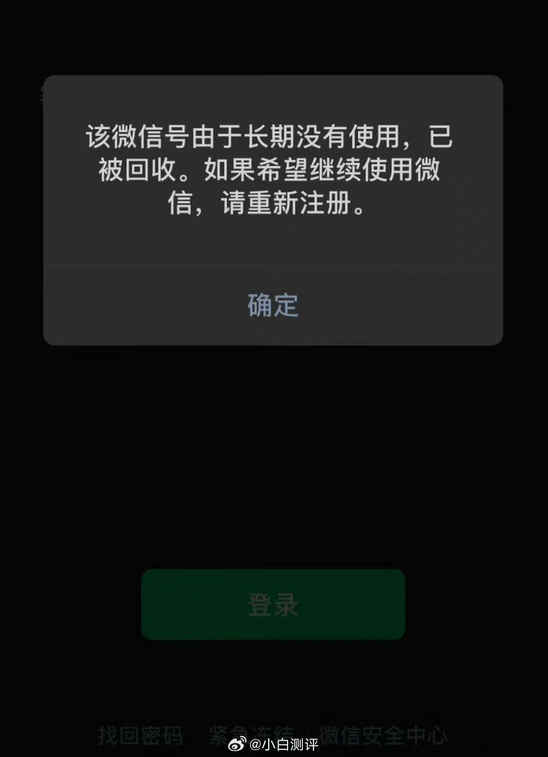 微博上,有多名用戶貼出圖片,指自己的帳號被封鎖,可見圖片寫上「該微信號由於長期沒有使用,已被回收」。
