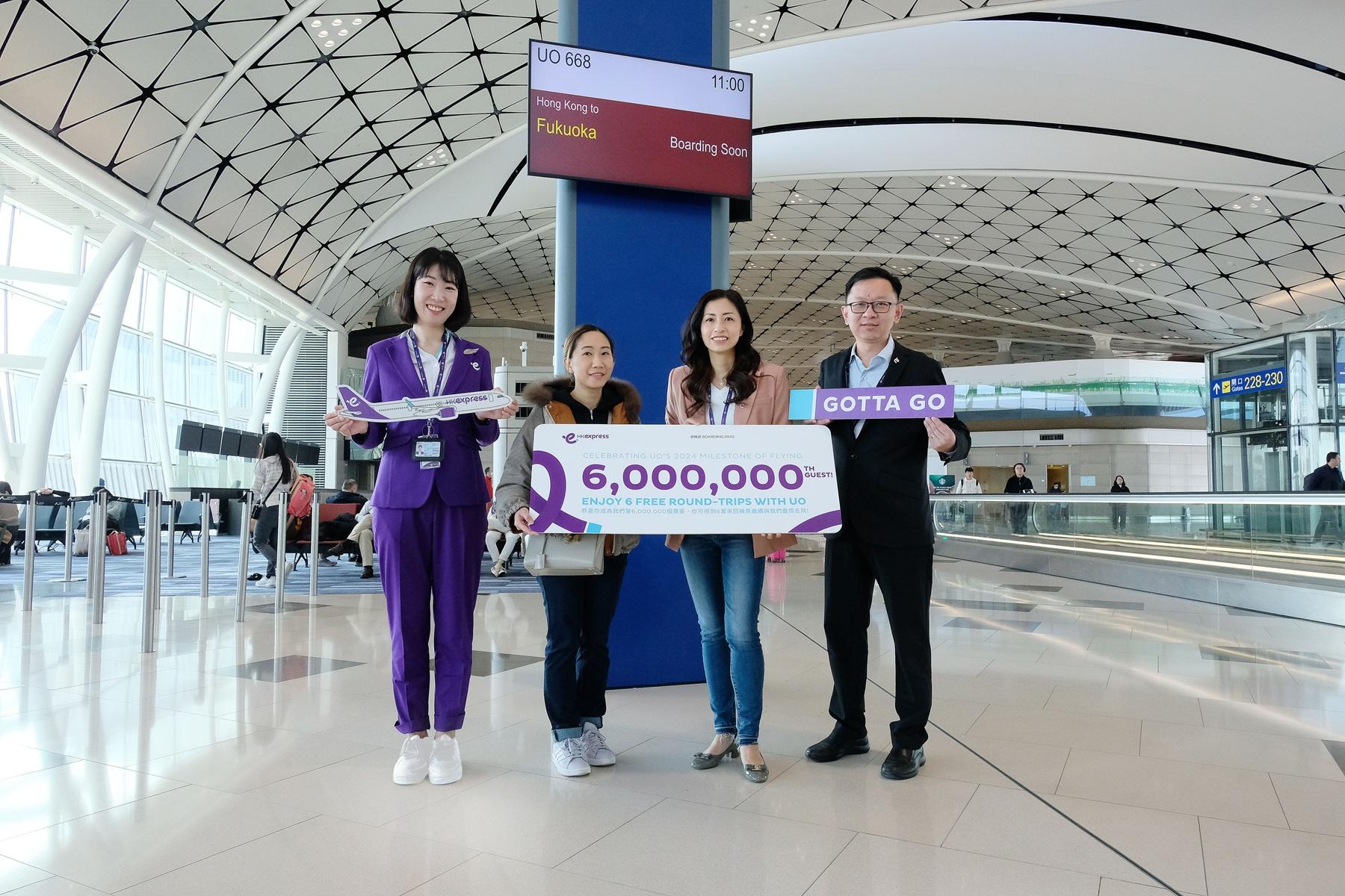 公司為慶祝此里程碑,管理層特地於當日香港飛往福岡的UO668航班登機閘口歡迎第600萬名幸運旅客溫小姐,並送上6套來回機票,以感謝她及所有旅客一直以來的支持。溫小姐可於未來1年內,從香港快運超過30個現有及新增航點中自由選擇航班。溫小姐驚喜地表示,從未想過自己會這麼幸運,會與家人一起計劃明年的旅遊行程;她特別喜歡自然風景,所以很可能會探索日本不同的目的地。