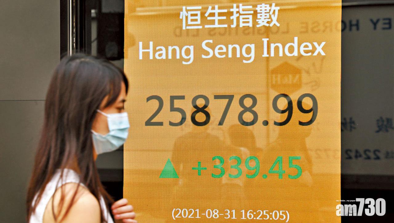 內地8月官方製造業及非製造業採購經理指數(PMI)均低於預期,拖低恒生指數早市一度挫429點,惟午後突轉勢倒升,競價時段更「嘜高」至全日高位的25,878點收市,大升339點或1.3%,單日低位反彈768點,為約一個月以來最大的單日波幅。科企反彈明顯,美團(3690)勁飆9%,阿里巴巴(9988)及騰訊控股(700)亦分別走高4.6%及3.3%,拖升恒生科技指數勁飆216點或3.4%,至6,607點。