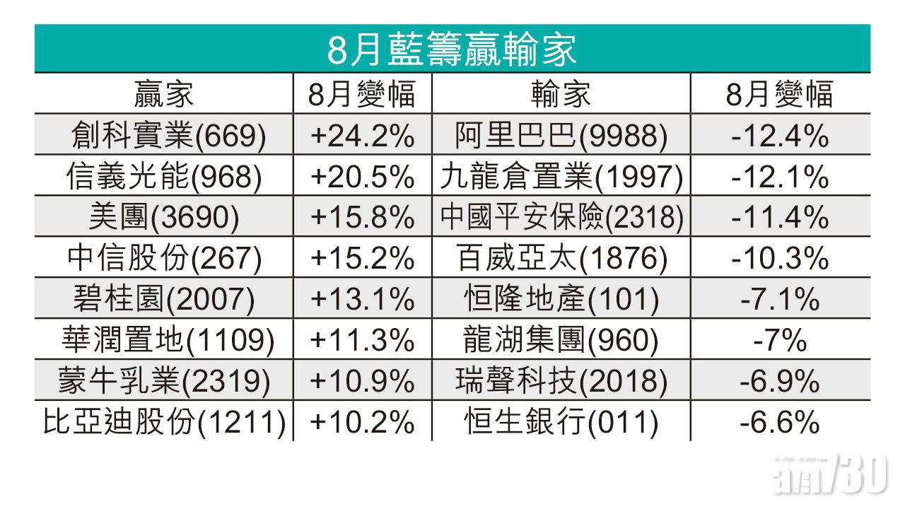 雖然大市昨氣勢佳,但全月計恒指仍要跌0.3%或83點,連跌3個月,累挫11.2%或3,273點。科指全月則跌2.6%,連跌兩月累失近19%。藍籌股全月計以創科實業(669)大升24.2%表現最佳,信義光能(968)亦升20.5%,美團則漲15.8%,躋身上月三大升幅王;相反持續未擺脫監管風暴的阿里巴巴大瀉12.4%表現最差,九龍倉置業(1997)及中國平安保險(2318)分別跌12.1%及11.4%,緊隨其後。至於科指股大贏家為聯想集團(992)及金蝶國際(268),分別揚19.1%及16.9%,快手(1024)則累瀉23.3%,表垷最差,平安好醫生(1833)亦失20.8%。