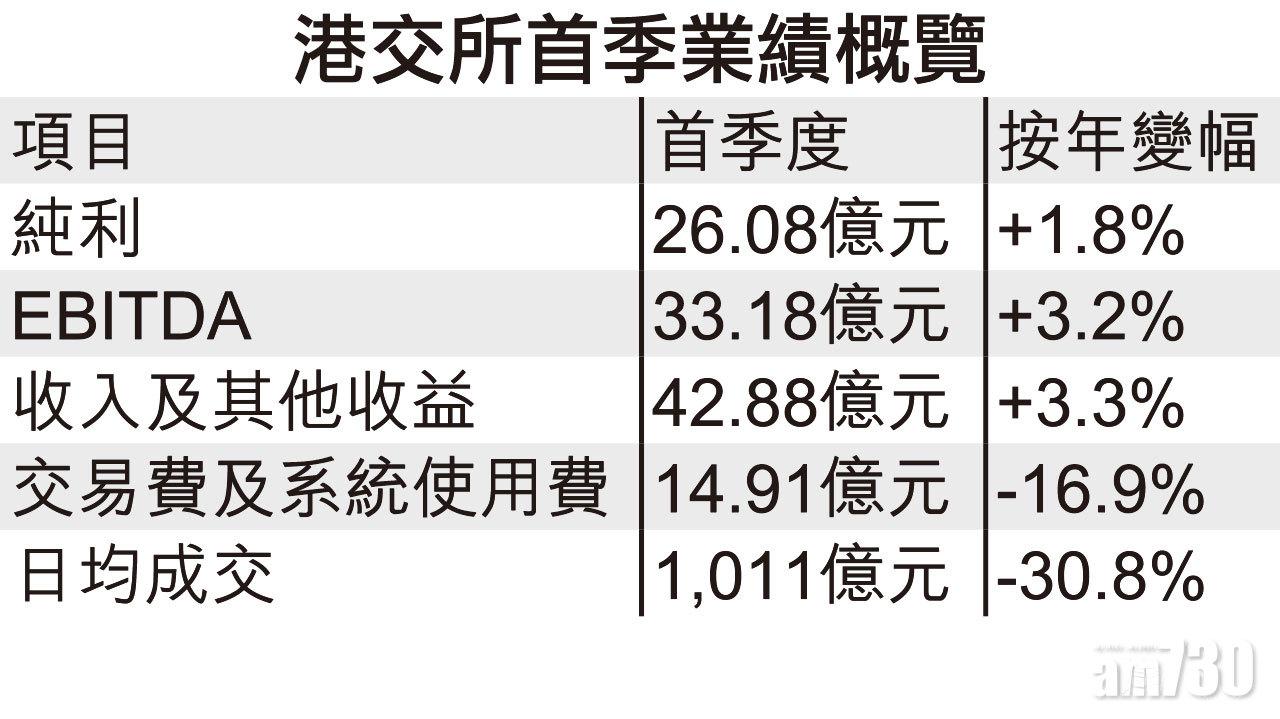 港交所(388)公布今年首季成績,按年多賺1.8%,至26.08億元,勝預期,按季則升42.6%。其中滬深港通的收入及其他收益2.32億元,飆34.9%,創季度新高;投資收益等更漲1.3倍,至8.8億元,惟主要業務收入普遍回落,其中交易費及系統使用費挫約17%,至14.91億元。
